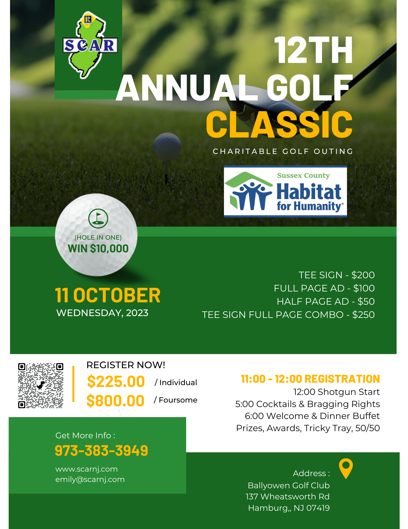 Sussex County Association of REALTORS® 12th Annual Golf Classic with a portion of our portion of our proceeds donated directly to the Sussex County Habitat for Humanity and their new build, benefitting a local family in need. For more information on the H4H build, please visit http://www.sussexcountyhfh.org Price for golf includes lunch, 18 holes, golf cart rental, a round on the house at the turn & dinner. SWAG bag, cigars on the course, hole in one contest, beat the pro, & much more! 11:00 Registration FOR ADDITIONAL SPONSORSHIP OPPORTUNITIES EMAIL: EMILY@SCARNJ.COM Golf Classic - Individual Player and Dinner Registration - $225 per player Golf Classic - Foursome and Dinner Registrations - $200 per player Dinner & Tricky Tray ONLY $80.0012th Annual Golf Classic