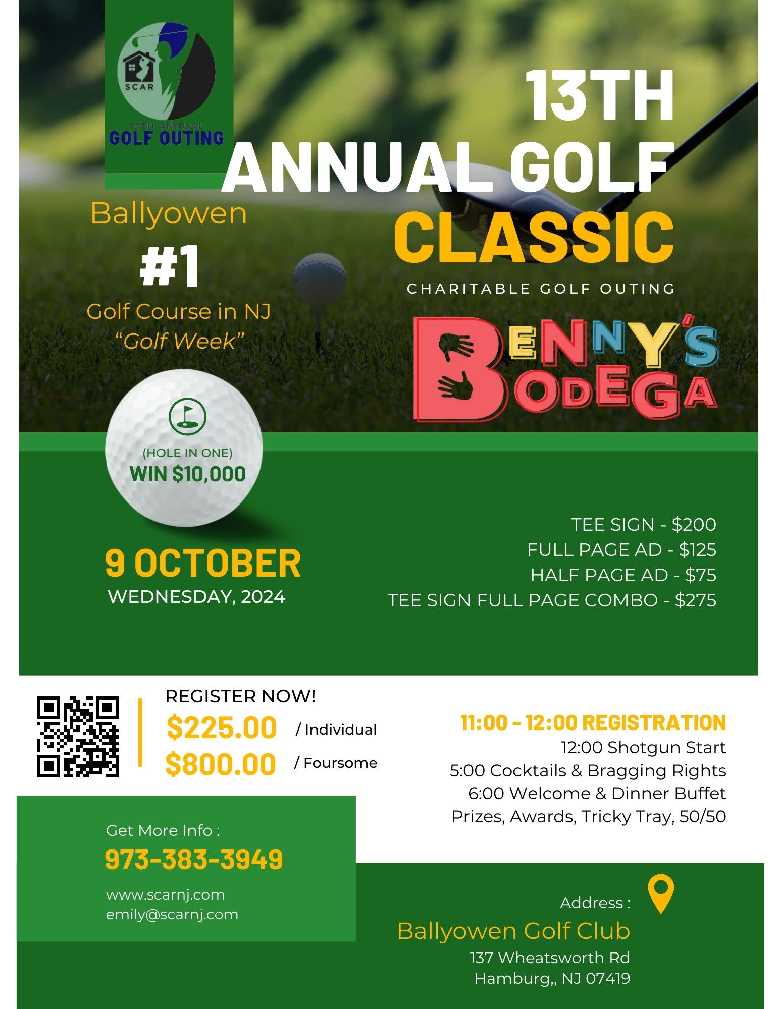 SOLD OUT You can still contribute to the cause by donating raffle baskets and bottles of wine. Contact Emily for more info! 13th Annual Golf Classic with a portion of our portion of our proceeds donated directly to Benny's Bodega, a one-stop shop providing necessary items for under-served members of our community. For more information on Benny's Bodega and their mission, visit www.bennysbodega.com Price for golf includes lunch, 18 holes, golf cart rental, a round on the house at the turn, dinner, SWAG bag, cigars on the course, hole in one contest, beat the pro, & much more! 11:00 Registration FOR ADDITIONAL SPONSORSHIP OPPORTUNITIES EMAIL: EMILY@SCARNJ.COM Golf Classic - Individual Player and Dinner Registration - $225 per player Golf Classic - Foursome and Dinner Registrations - $200 per player Dinner & Tricky Tray ONLY $80.0013th Annual Golf Classic