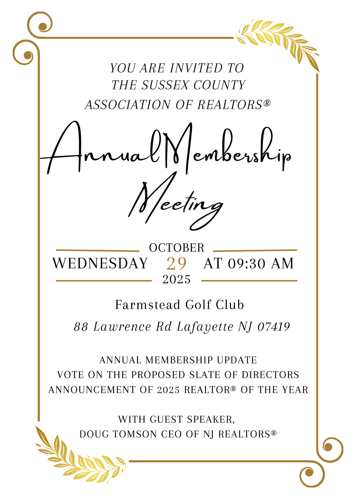 Annual Meeting The Sussex County Association of REALTORS® Annual Meeting!! Breakfast will be provided. We proudly welcome our guest speaker New Jersey REALTORS® CEO Doug Tomson. We'll have updates and information from around the Association including a presentation from our Board Treasurer, Christopher Ohab, on the 2026 Budget. Hear from our leaders and vote for the proposed 2026 slate of Directors! We'll round out the meeting with the announcement of SCAR's REALTOR® of the Year!ANNUAL MEETING: Sussex County Association of REALTORS® 2025 Annual Meeting