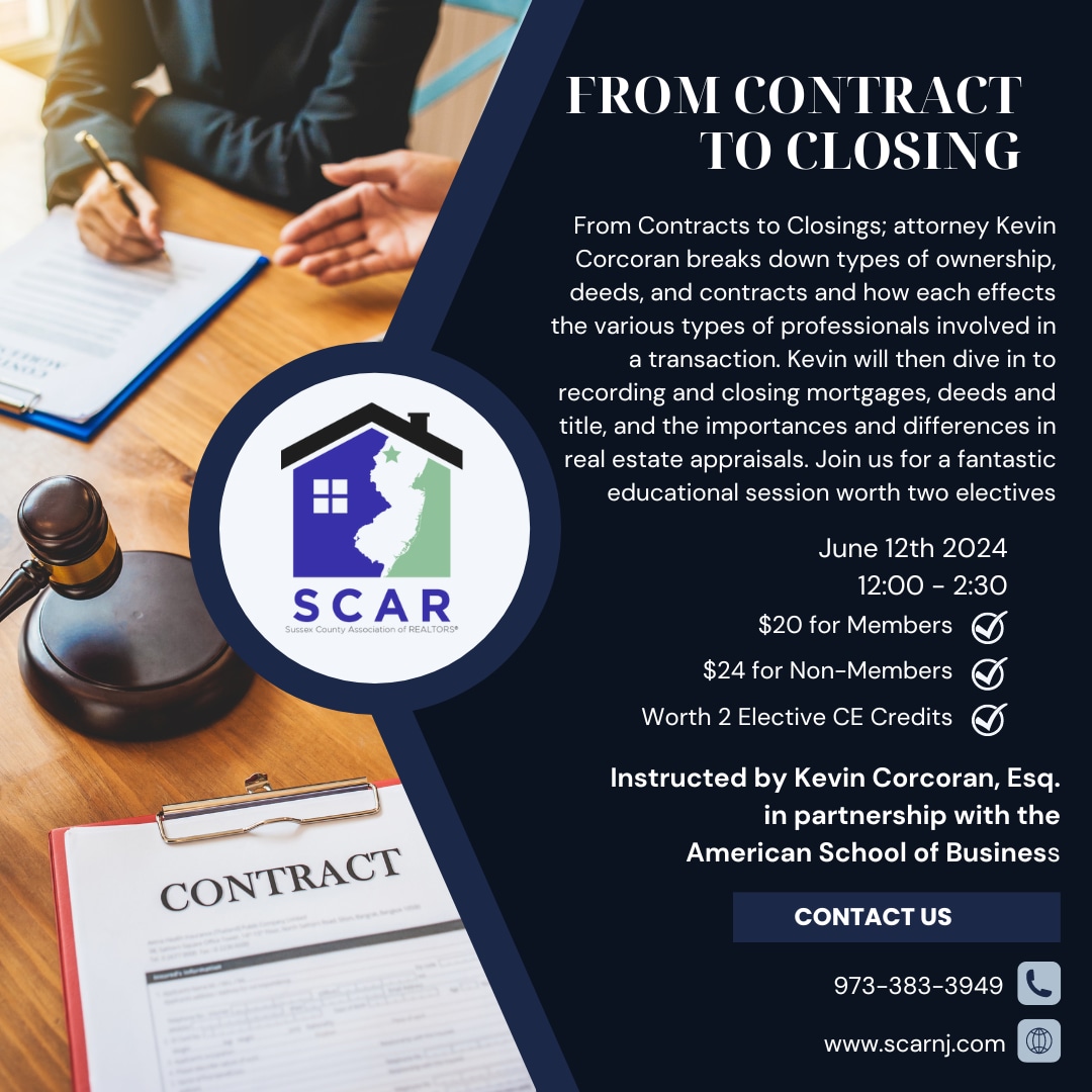From Contracts to Closings; attorney Kevin Corcoran breaks down types of ownership, deeds, and contracts and how each effects the various types of professionals involved in a transaction. Kevin will then dive in to recording and closing mortgages, deeds and title, and the importances and differences in real estate appraisals. Join us for a fantastic educational session worth two elective credits. CE CLASS: From Contracts to Closings