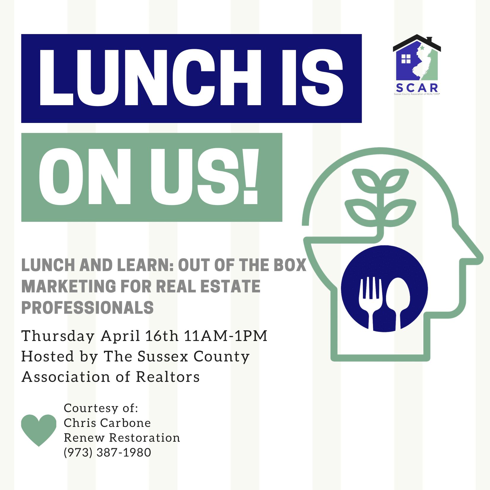 Imagine a world where real estate isn't just about listings and open houses—it's about creating unforgettable experiences. In our whirlwind two-hour journey, we explore the uncharted territories of real estate marketing, daring to think beyond the conventional and embrace the extraordinary. Hosted by Chris Carbone of Renew Restoration This is a FREE event for SCAR members, however, "no-shows" will incur a $10 FEE if you cancel less than 48 hours before the event. Please respect that our hosts are providing lunch and including you in that headcount.Lunch and Learn: Out Of The Box Marketing for Real Estate Professionals