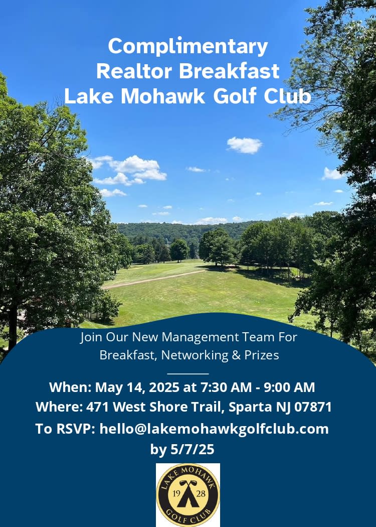 Join the new management team at Lake Mohawk Golf Club for a Complimentary REALTOR® Breakfast with Networking and Prizes! This is a wonderful opportunity for REALTORS® to meet the new management team and explore the amenities and services that LMGC can offer to your clients and the community. To RSVP: Email hello@lakemohawkgolfclub.com by 5/7/25 471 West Shore Trail Sparta, NJ 07871
